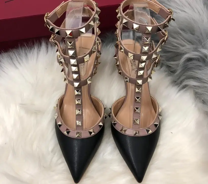 Женские босоножки на высоком каблуке 6 см, дизайнерские черные/телесные классические брендовые босоножки с V-образным вырезом и заклепками, ...