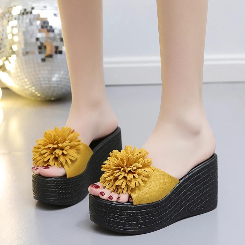 Женские босоножки на танкетке на платформе, новинка 2022, женские шлепанцы, милые летние пикантные шлепанцы с открытым носком и цветами на выс...