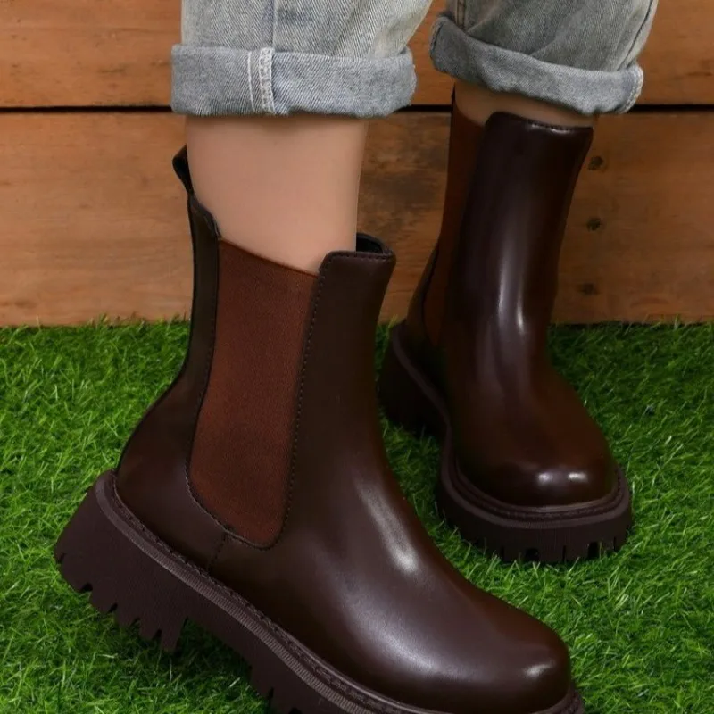 Женские ботильоны из ПУ кожи, на платформе, однотонные, без застежки, с круглым носком, стрейчевые, на каблуке, 2023
