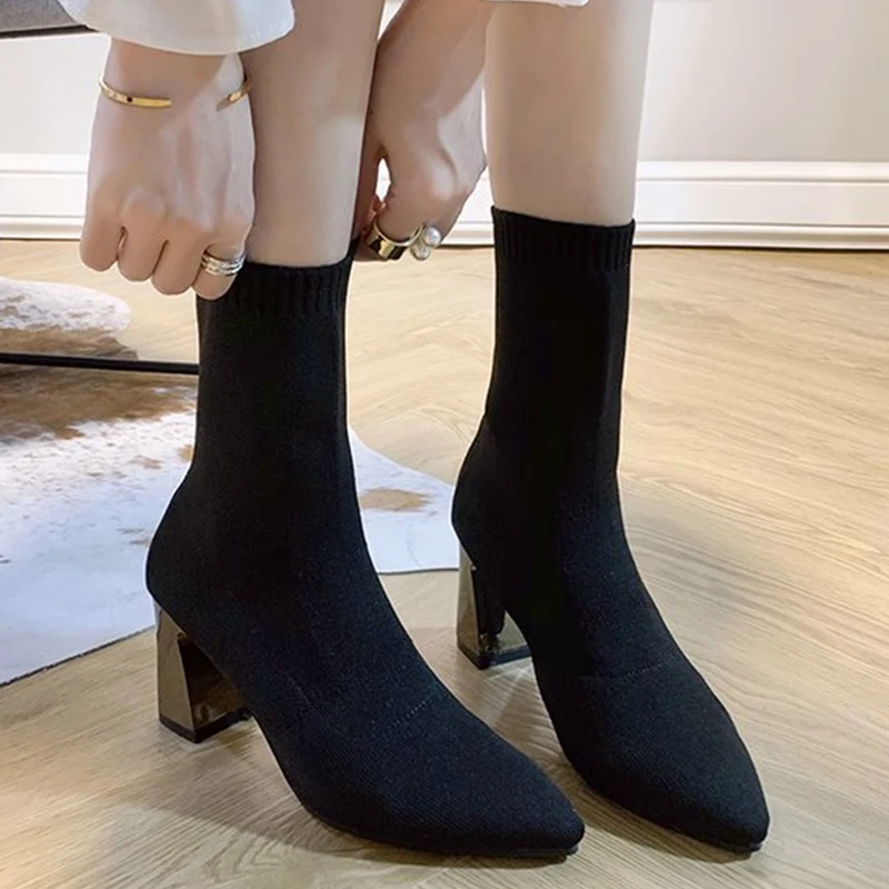 Женские ботильоны на высоком каблуке, с острым носком, зимние теплые вязаные туфли-лодочки, гладиаторы, 2024