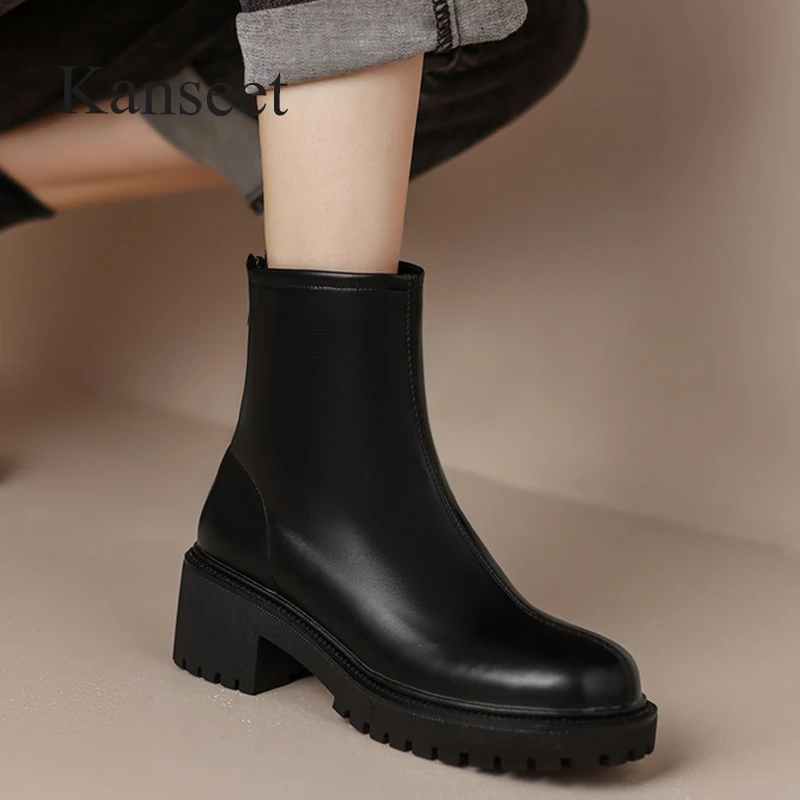 Женские ботильоны на платформе Kanseet, черные эластичные ботинки на массивном каблуке, с круглым носком, Осень-зима 2022