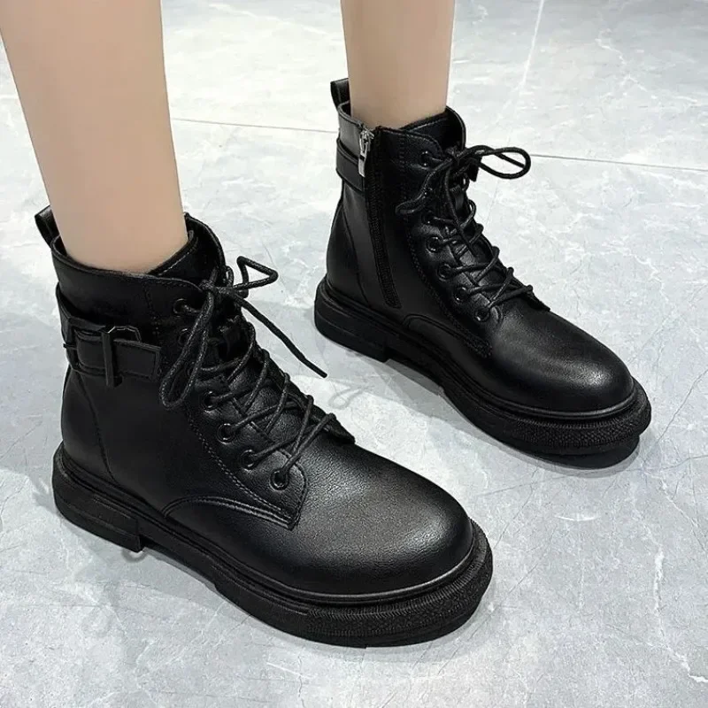 Женские ботильоны на шнуровке, зимние ботинки на платформе, женские ботинки с ремешком, пряжкой, круглым носком, боковой молнией, обувь на квадратном каблуке, 2023
