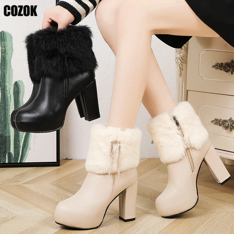 Женские ботильоны с бантом, зимние ботинки из искусственной кожи на молнии, с круглым носком, на толстом высоком каблуке, женские теплые бот...