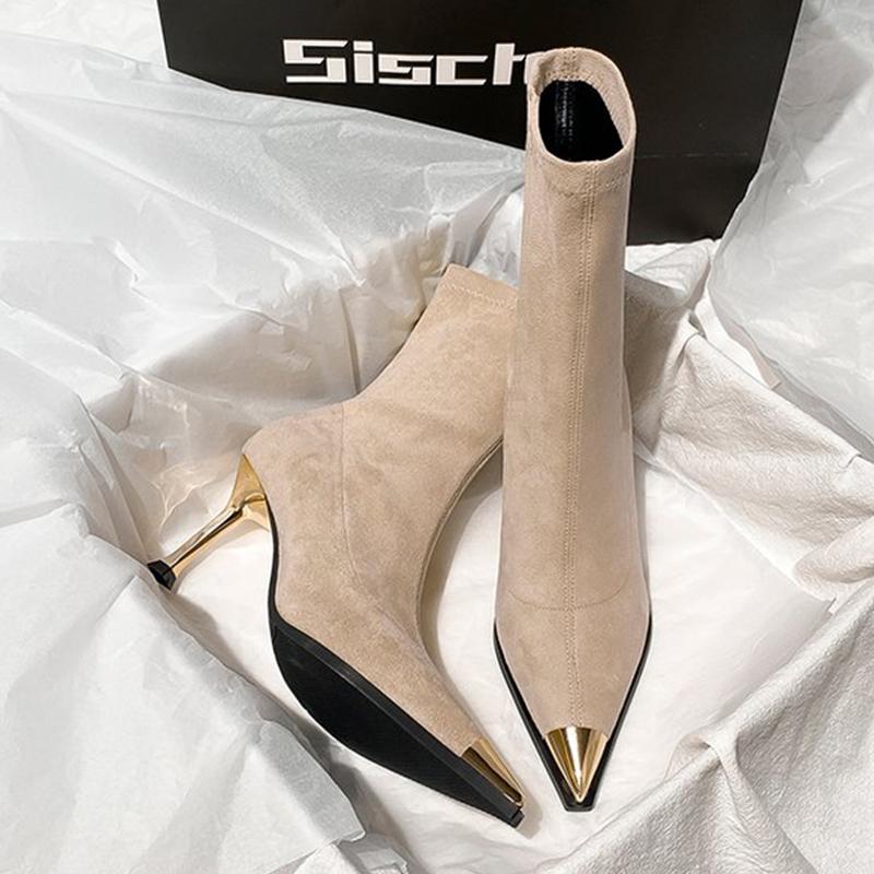 Женские ботильоны с острым носком на высоком каблуке, сексуальная обувь для платья, замшевые, роскошные, зимние, ботильоны 2025, новые элегантные туфли-лодочки, женские ботинки 39 абрикосовый