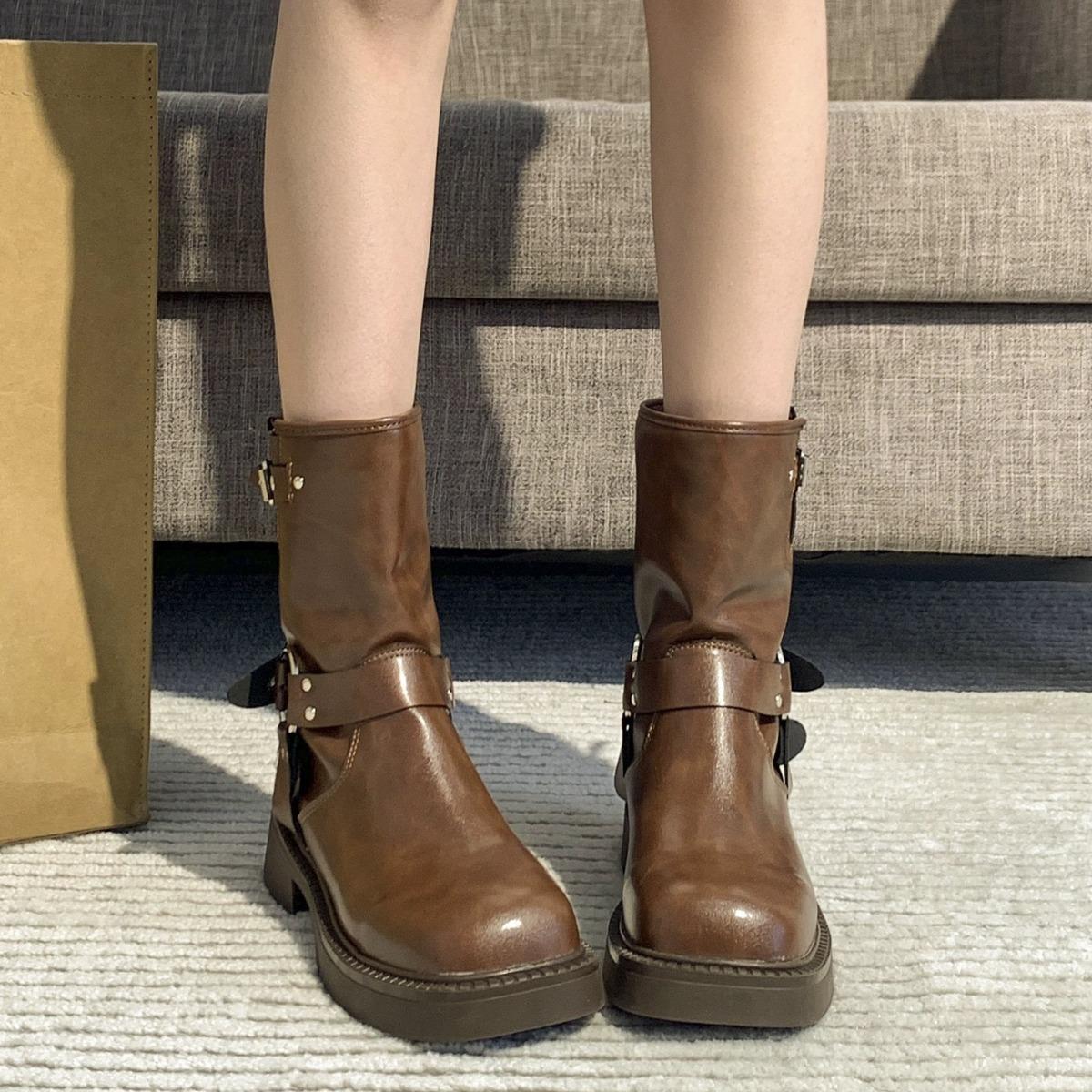 Женские ботильоны Vanitee, ботинки до середины икры, армейские ботинки для езды на мотоцикле с квадратным носком и пряжками для женщин, осенние байкерские ботинки на низком массивном каблуке 42 коричневый