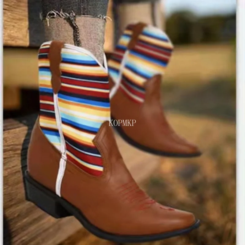 Женские ботинки в западном стиле, кожаные ботинки ручной работы до середины икры с острым носком и резиновой подошвой, без застежки, на плат...