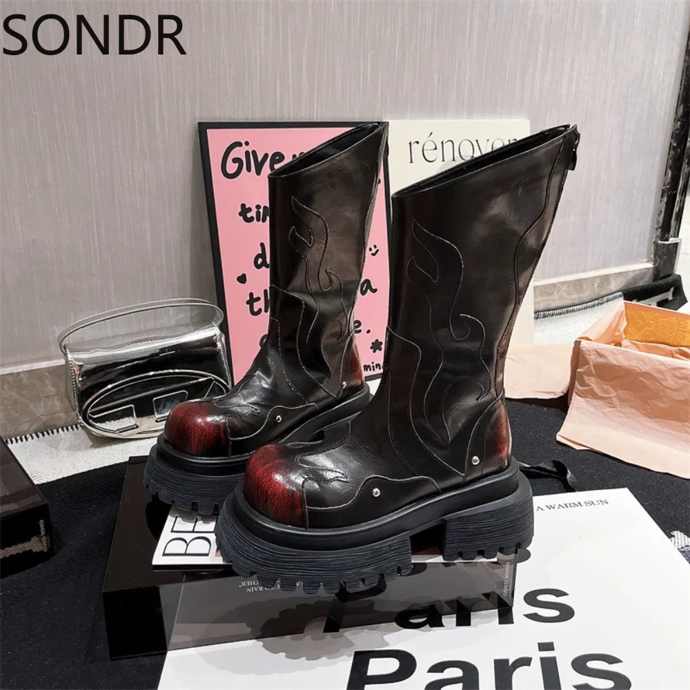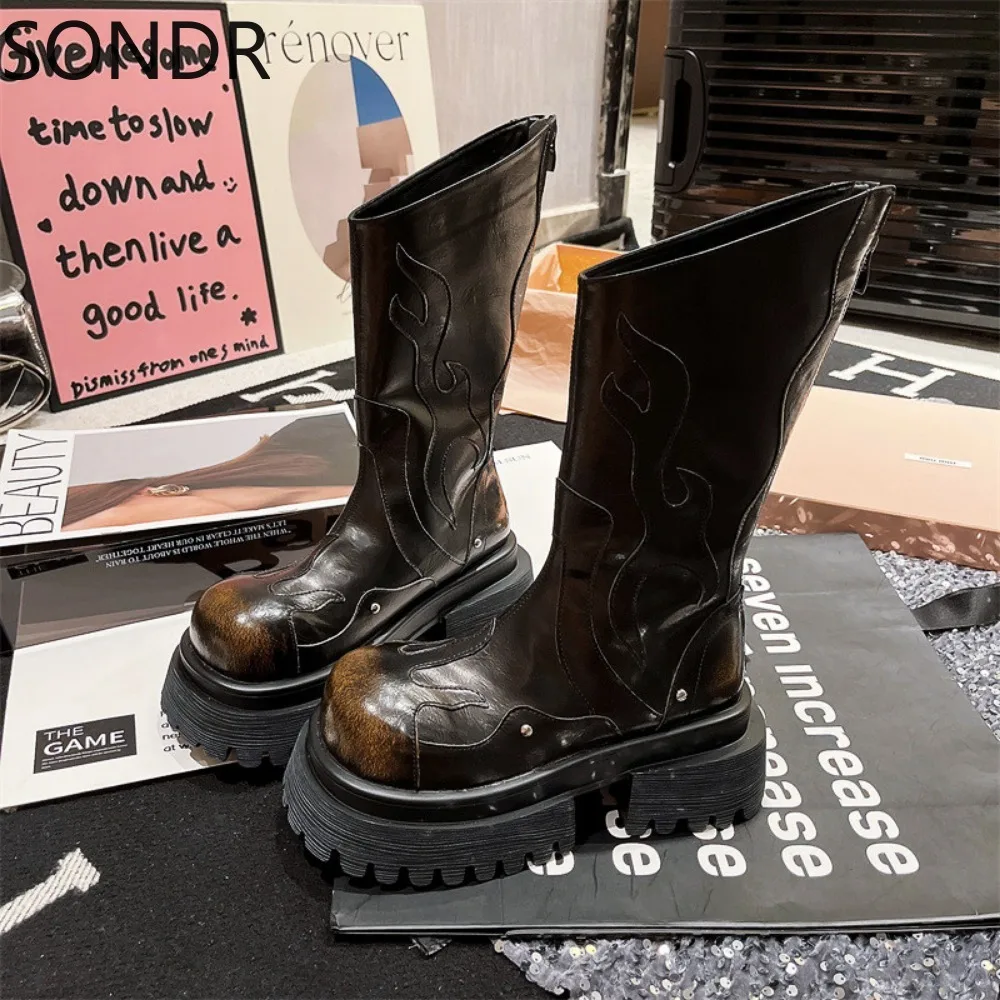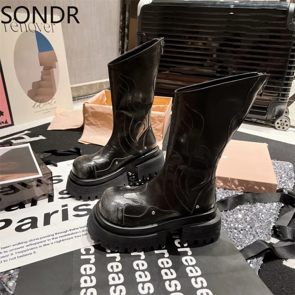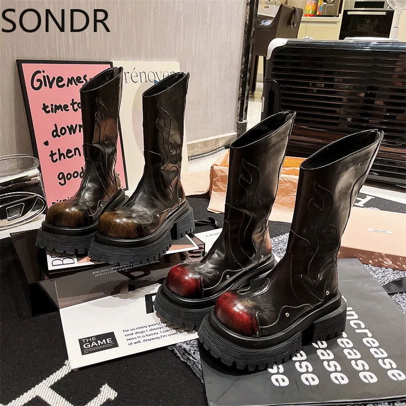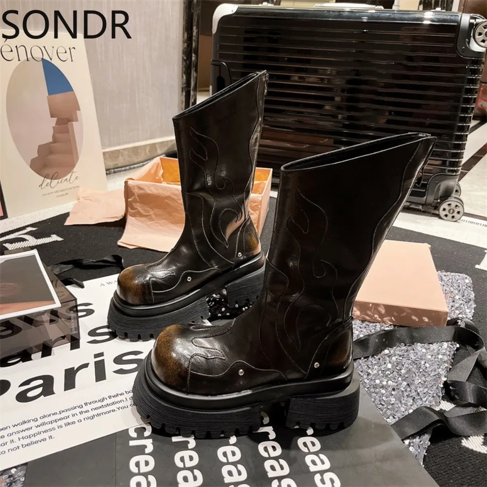 Женские ботинки до середины икры из натуральной кожи, с круглым носком