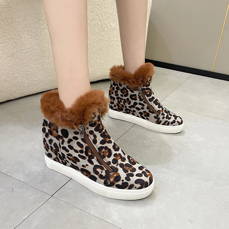Женские ботинки, замшевые ботинки на танкетке с плюшевым принтом, новые зимние сексуальные простые ботильоны на молнии с леопардовым принтом, модная женская обувь
