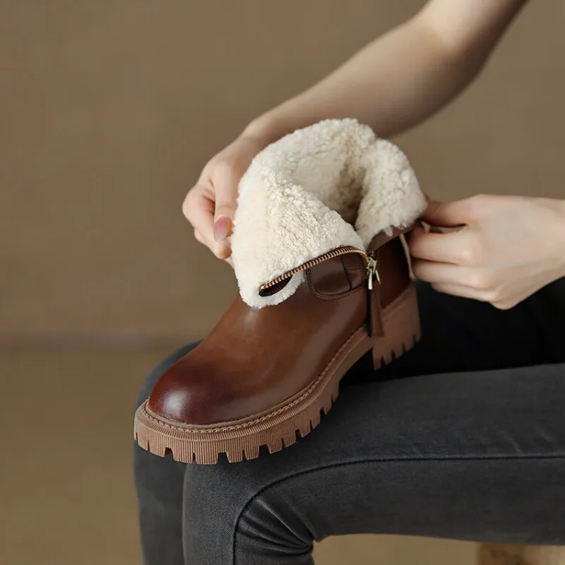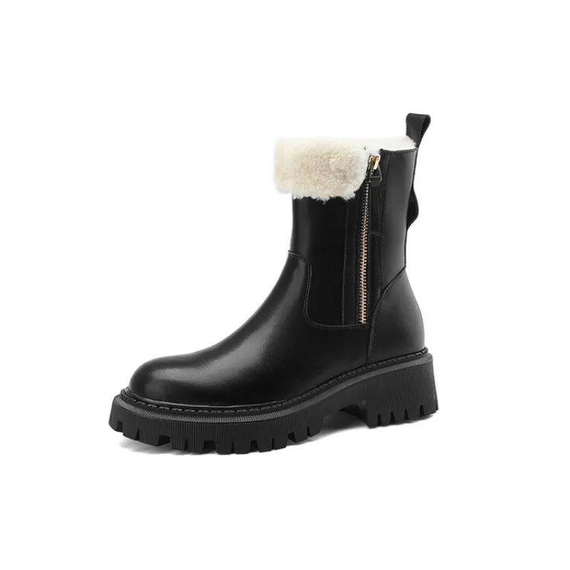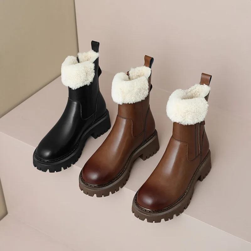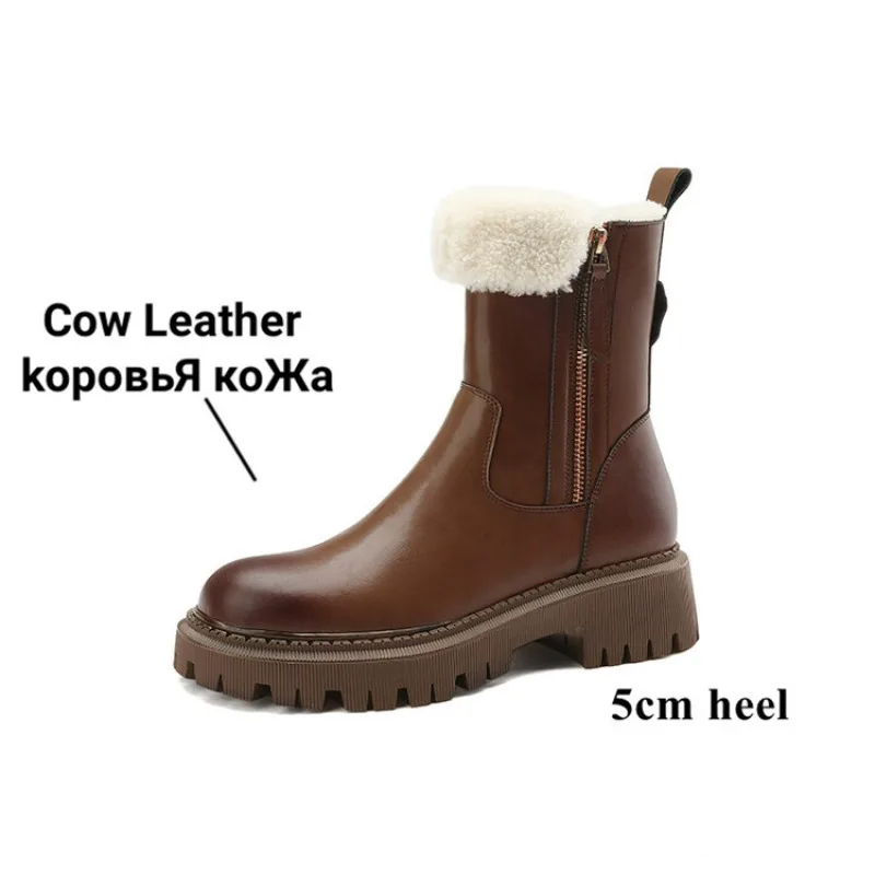 Женские ботинки из натуральной кожи с мехом овечьей шерсти на массивном каблуке