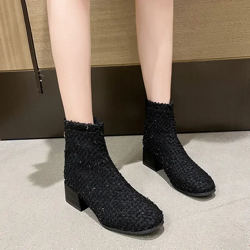 Женские ботинки на квадратном каблуке, теплые однотонные ботильоны с молнией сзади, зимняя обувь, 2023
