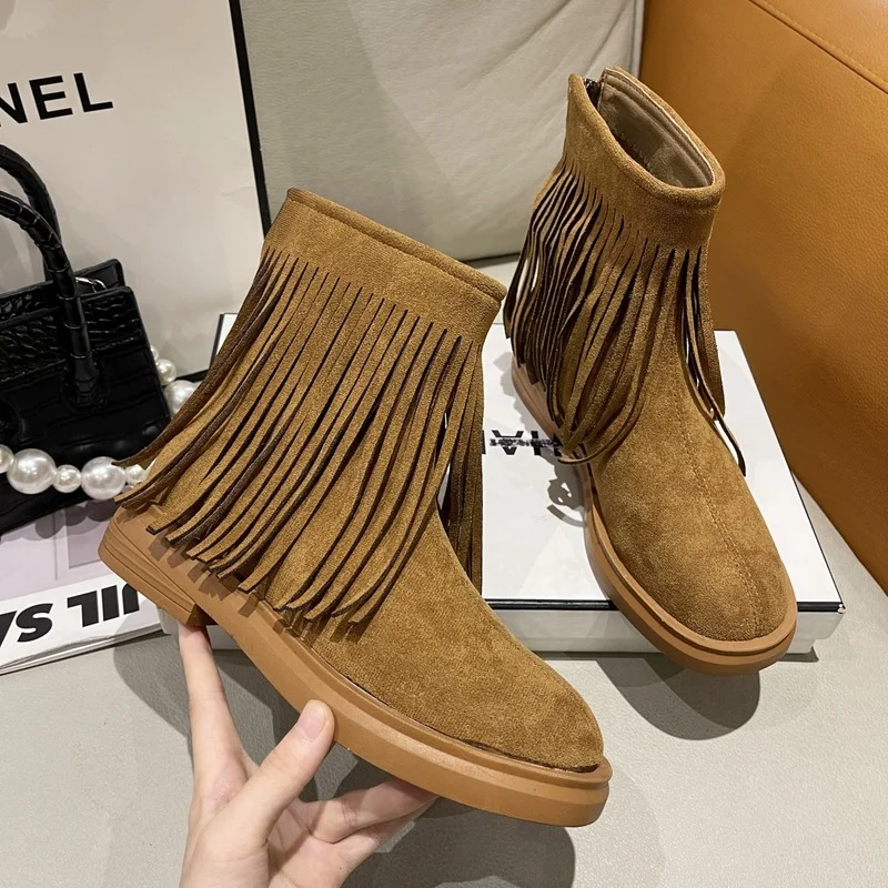 Женские ботинки, новинка 2022, богемные мотоциклетные ботинки на низком каблуке, женские ковбойские ботинки с бахромой, осенние женские ботин...