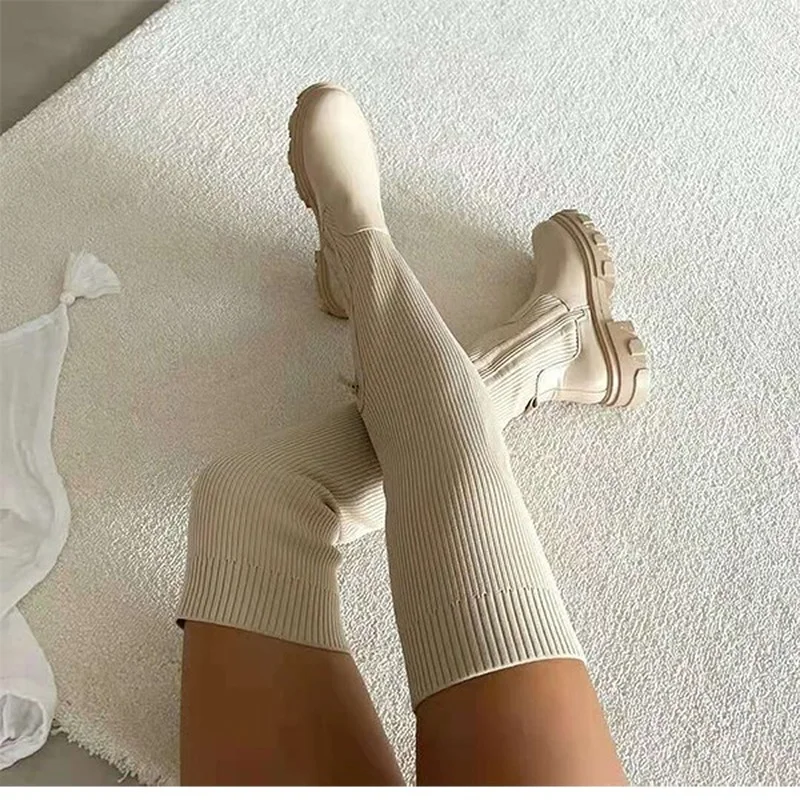 Женские ботфорты на плоской подошве, однотонные сапоги-носки с боковой молнией, Осень-зима 2023