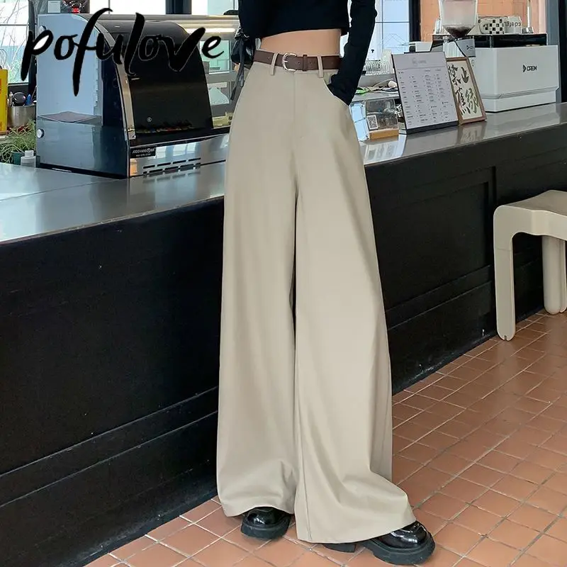 Женские брюки из искусственной кожи с завышенной талией и широкими штанинами, свободные длинные брюки, женские коричневые классические винтажные брюки на осень и зиму