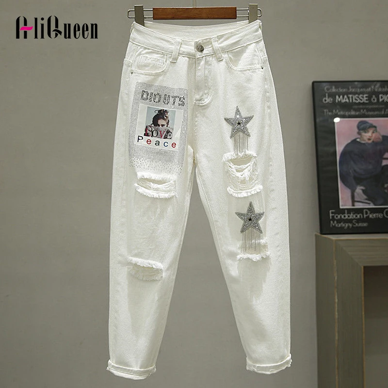 Женские брюки-карандаш, весенне-осенние повседневные штаны из Харлана с белыми звездами и бахромой, с дырками, с надписью