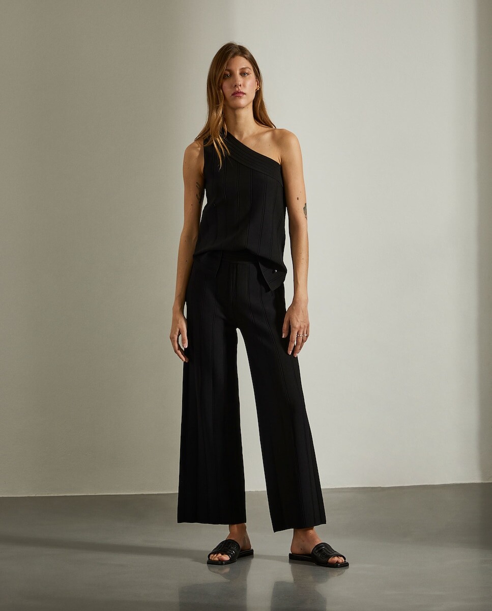 брюки-кюлоты из структурированной сетки. Талия на резинке. Возможен вариант рубашки в тон.
