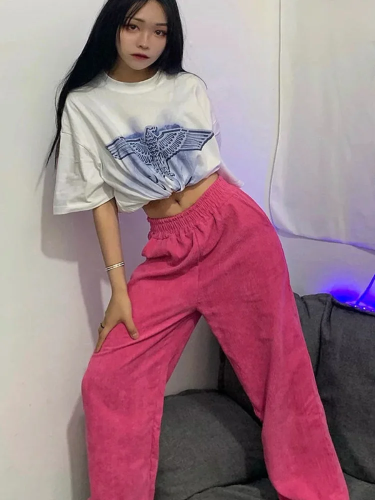 Женские вельветовые брюки, розовые прямые брюки с широкими штанинами и высокой талией в Корейском стиле, лето