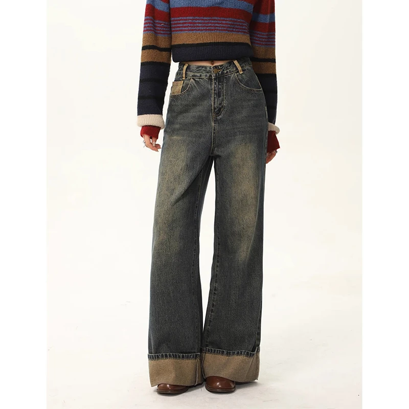 Женские винтажные джинсы с широкими штанинами, повседневные свободные прямые брюки с высокой талией и эффектом потертости, Осень-зима
