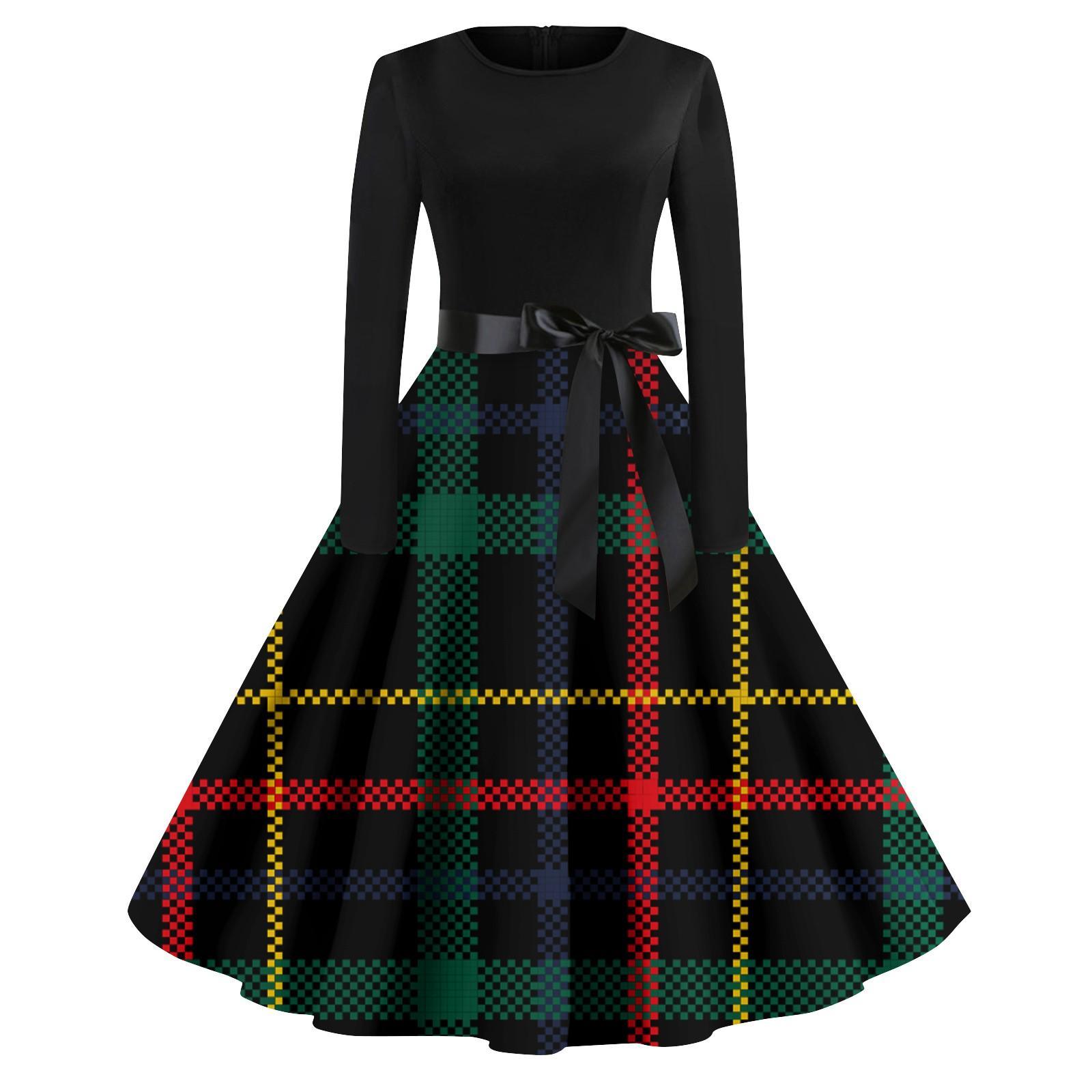 Женские винтажные клетчатые платья с длинным рукавом и круглым вырезом больших размеров для выпускного вечера XL чёрный
