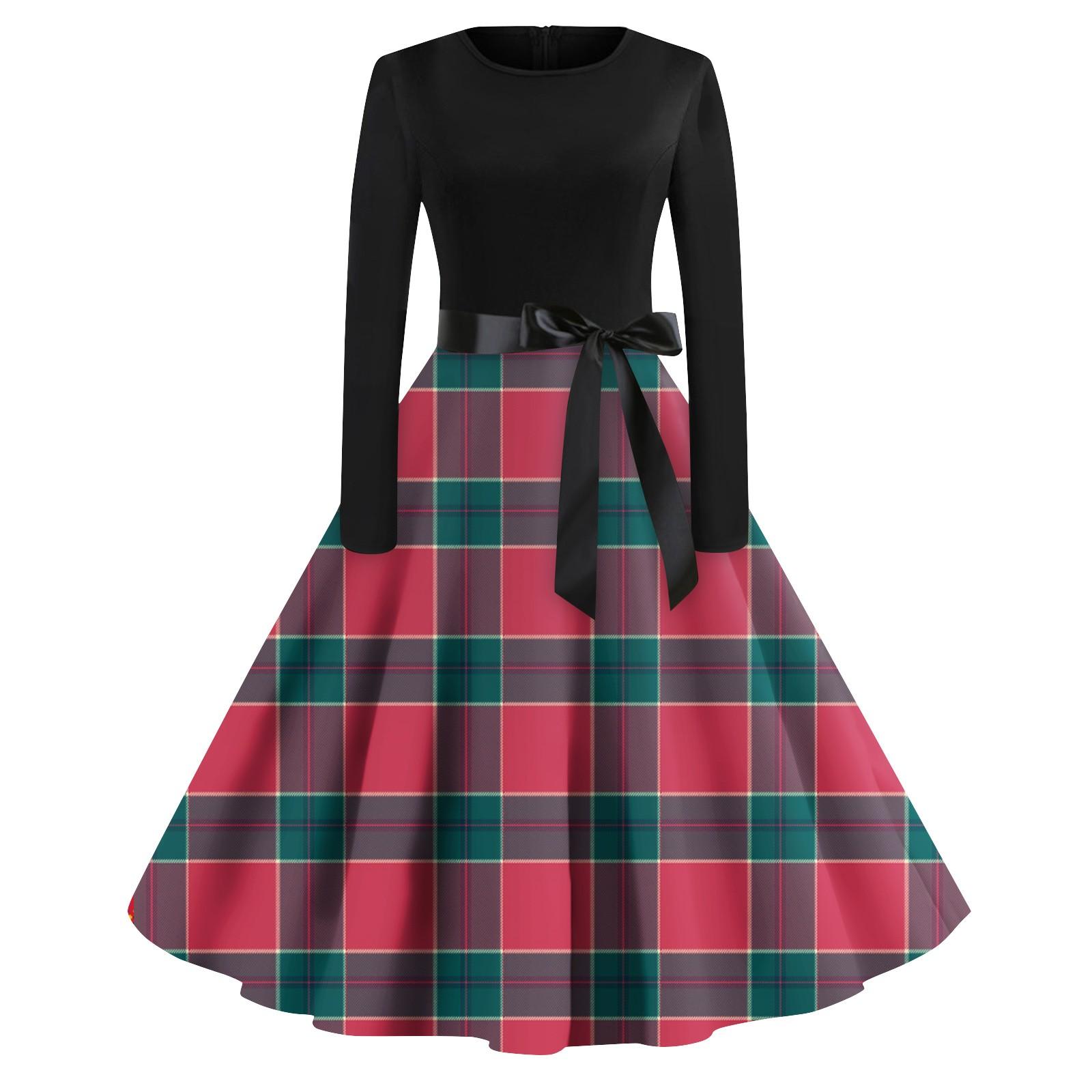 Женские винтажные клетчатые платья с длинным рукавом и круглым вырезом больших размеров для выпускного вечера L