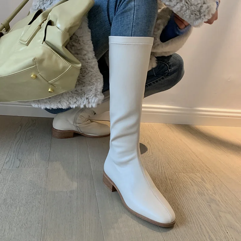 Женские высокие белые сапоги до бедра, с квадратным каблуком и молнией