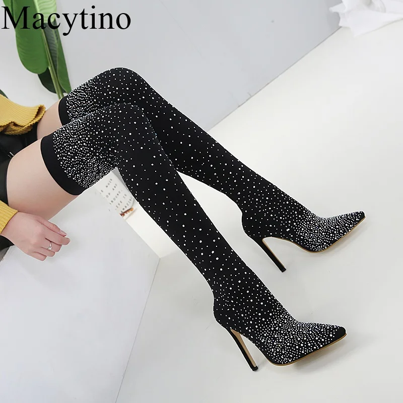 Женские высокие сапоги выше колена, сапоги до бедра на высоком каблуке 12 см, с кристаллами и стразами, обувь для зачистки, 2022
