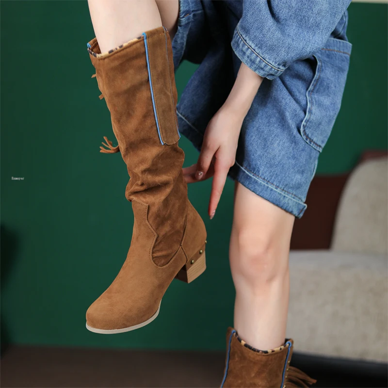 Женские высокие сапоги с бахромой ENMAYER, зимние сапоги до колена на тонком каблуке, модные привлекательные вечерние сапоги, размеры 34-43, 2023