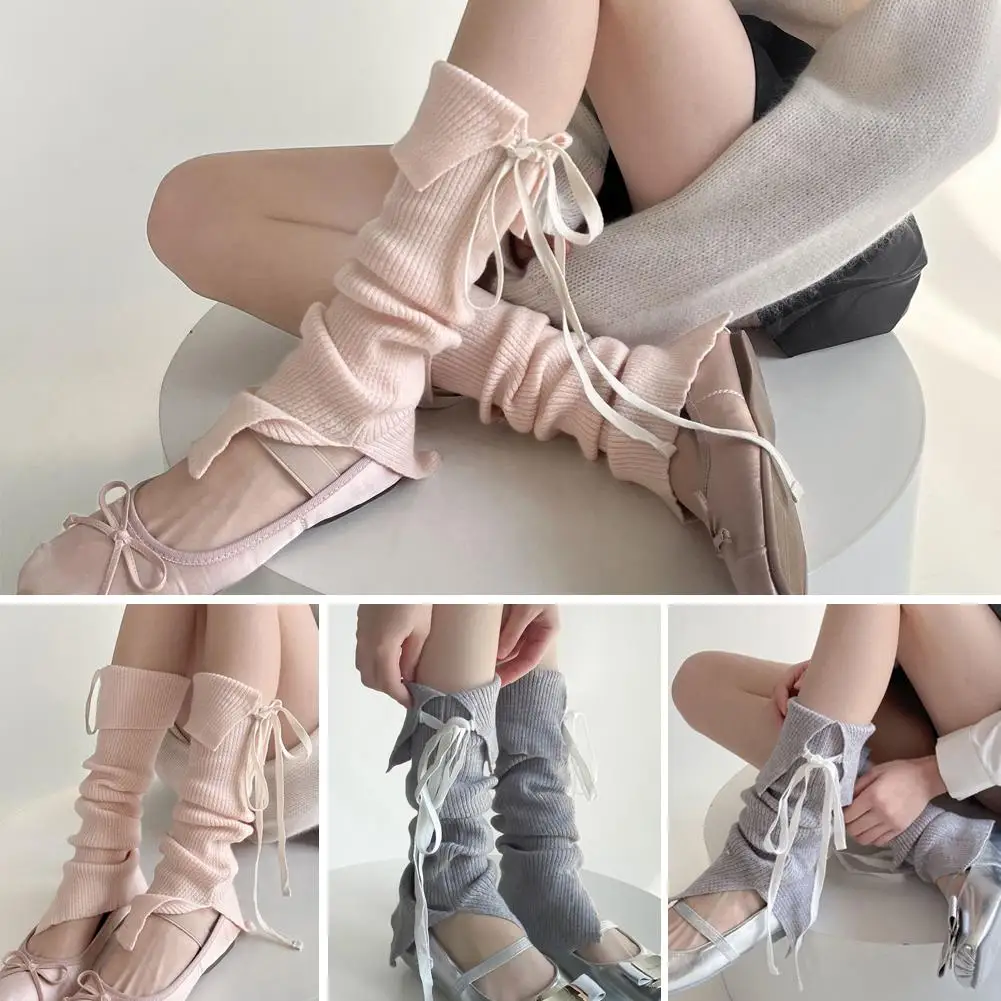 Женские гетры на осень и зиму, черные вязаные белые гетры в Стиле Лолита с лентой, Длинные Гетры JK E7J5
