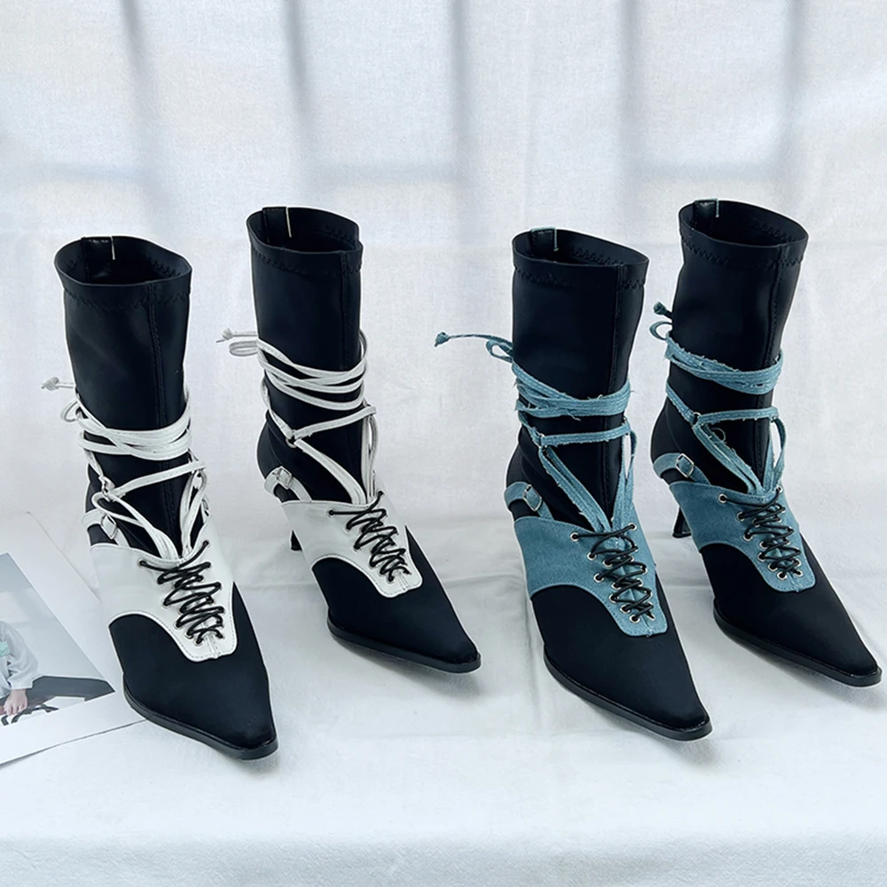 Женские джинсовые ботинки с острым носком, белые, синие, черные ботинки до середины икры на тонком высоком каблуке, Размеры 35-39, для осени и з...