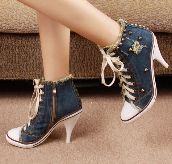 Женские джинсовые туфли на высоком каблуке, на шнуровке, с заклепками