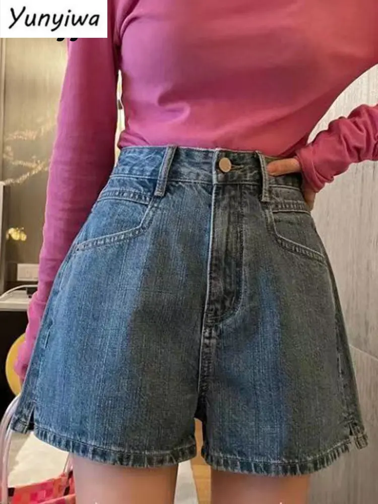Женские джинсовые шорты с завышенной талией-трапециевидные корейские джинсовые шорты с разрезом удобные повседневные синие широкие брюки