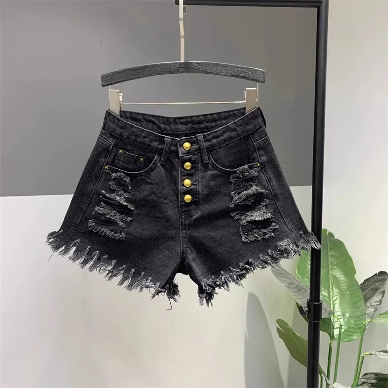 Женские джинсовые шорты с завышенной талией, универсальные Узкие рваные брюки с дырками и широкими штанинами с необработанными краями, лето 2024