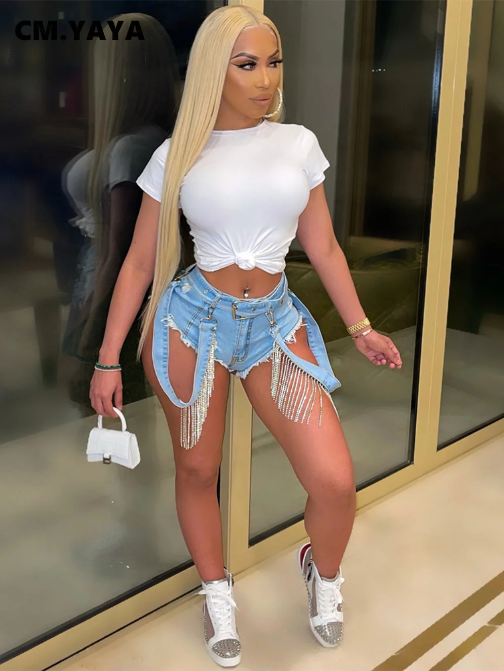 Женские джинсовые шорты CM.YAYA, летние классические джинсовые шорты со стразами и бахромой, 2022