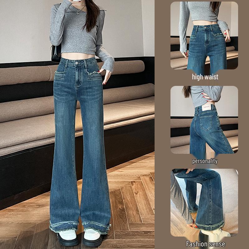 Женские джинсы микро-клеш с высокой посадкой - Темно-синий, Рваный край, Слимминг, Свободный крой, Весна/Осень 2025 XS