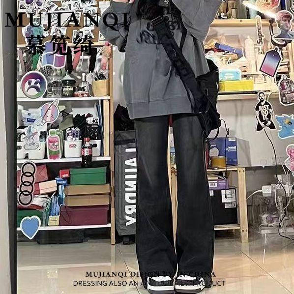 Женские джинсы прямого кроя ретро в выбеленном черном цвете - с высокой посадкой, универсальные, стройнящие, широкие брюки для весны и осени.