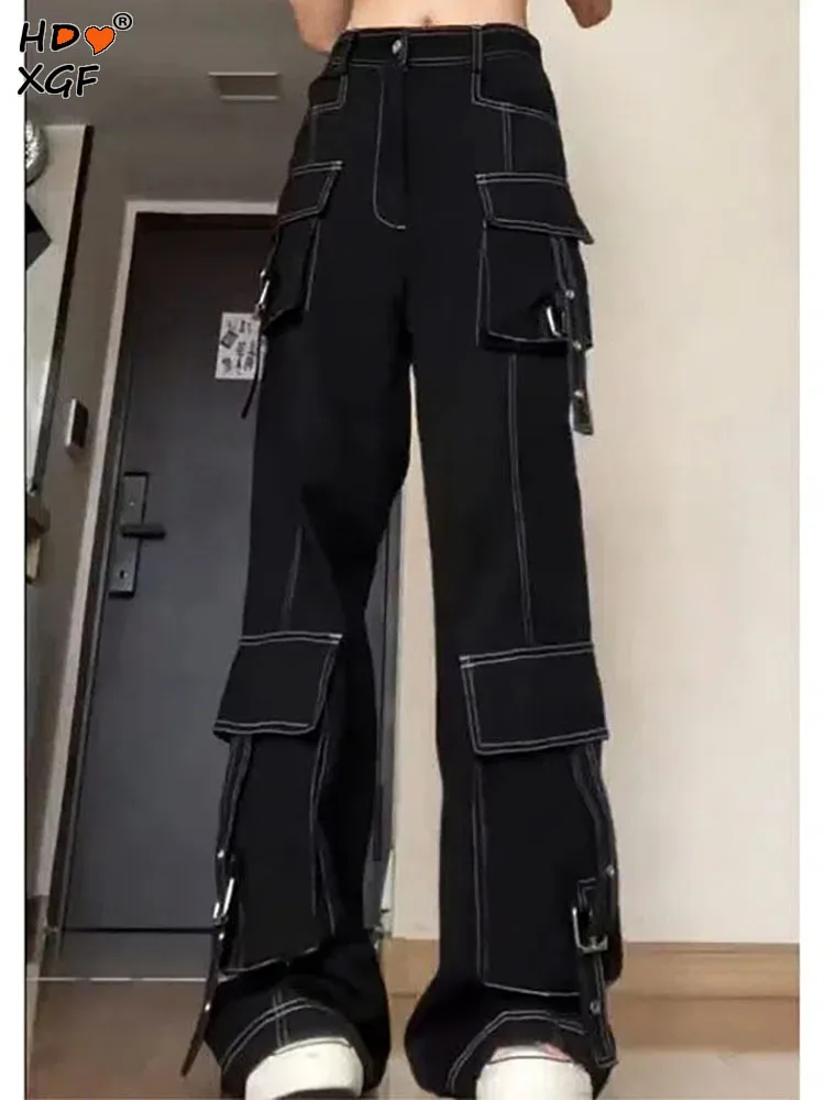 Женские джинсы с карманами, черные широкие джинсы с высокой талией, модель Y2k в студенческом стиле на весну, дизайнерские брюки в Корейском стиле