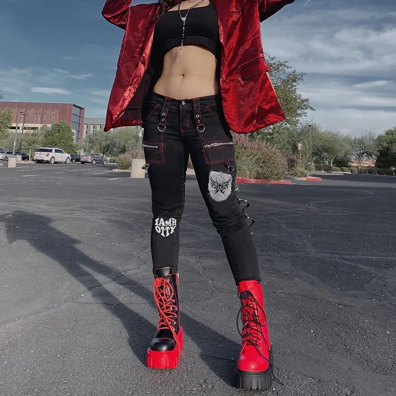 Женские джинсы с карманами WeiYao, черные обтягивающие джинсы в стиле гранж с принтом, Y2K, уличная одежда с низкой талией, джинсы-карго в стиле п...