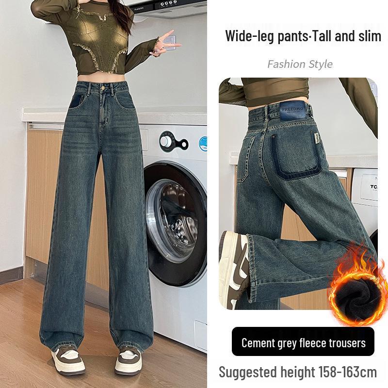 Женские джинсы цементно-серого цвета с U-образными карманами, широкие брючины, колор-блок, ретро, с высокой посадкой, на флисовой подкладке, свободные прямые брючины, зимний стиль XXL