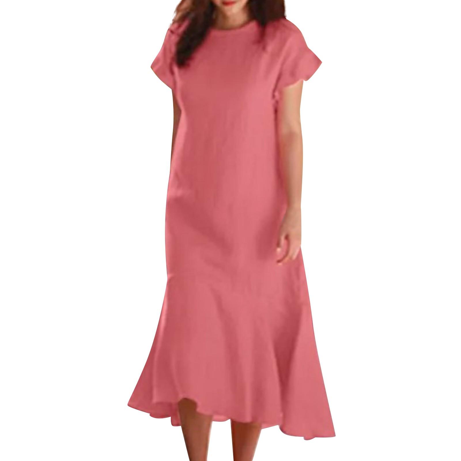 Женские длинные платья из хлопка и льна с круглым вырезом, оборками, короткими рукавами и нерегулярным краем XL розовый