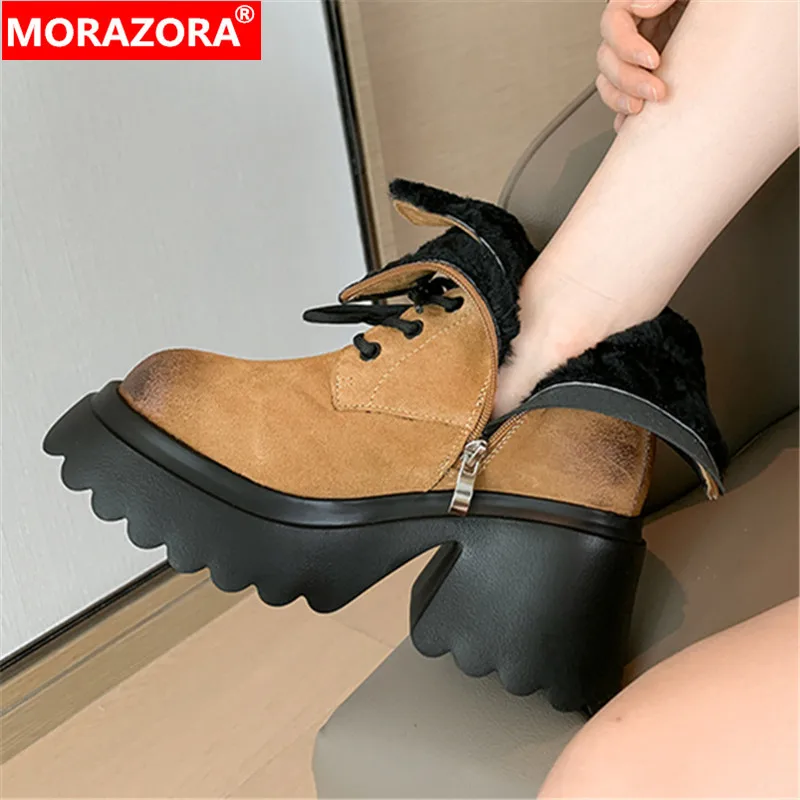 Женские замшевые ботильоны MORAZORA, черные замшевые ботильоны с узкими ремешками, на платформе и молнии, новинка зимнего сезона 2024