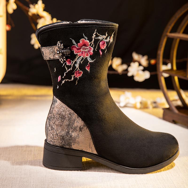 Женские зимние ботинки с боковой молнией, теплые, нескользящие, на низком толстом каблуке, с вышивкой, ботинки для ходьбы с подкладкой из искусственного меха, обувь для женщин 40