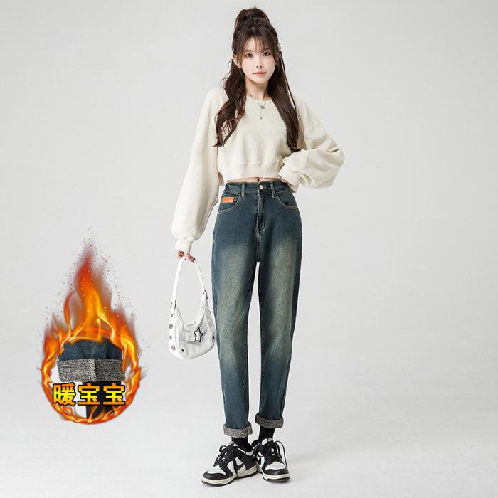 Женские зимние джинсы больших размеров из плотного флиса с высокой талией, свободные и стройнящие S