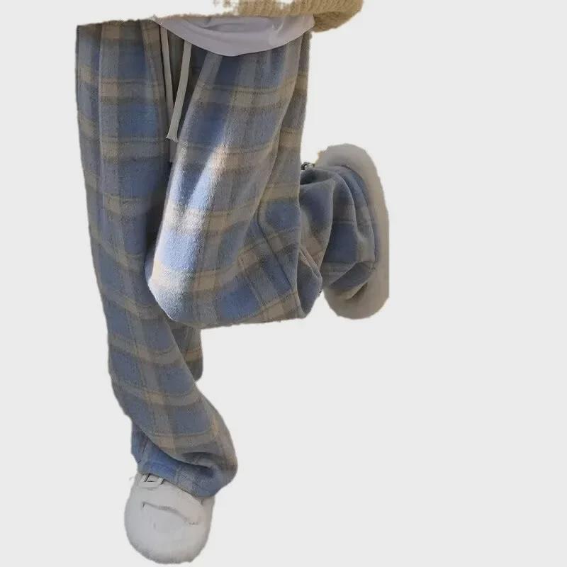 Женские клетчатые брюки с высокой талией и широкими штанинами — осень/зима 2023 г., смесь шерсти и хлопка L синий