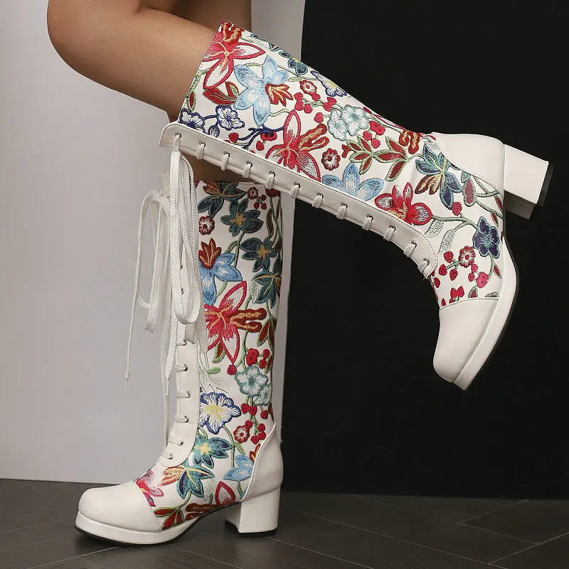 Женские ковбойские ботильоны до середины икры с цветочным принтом, на шнуровке, на квадратном массивном каблуке