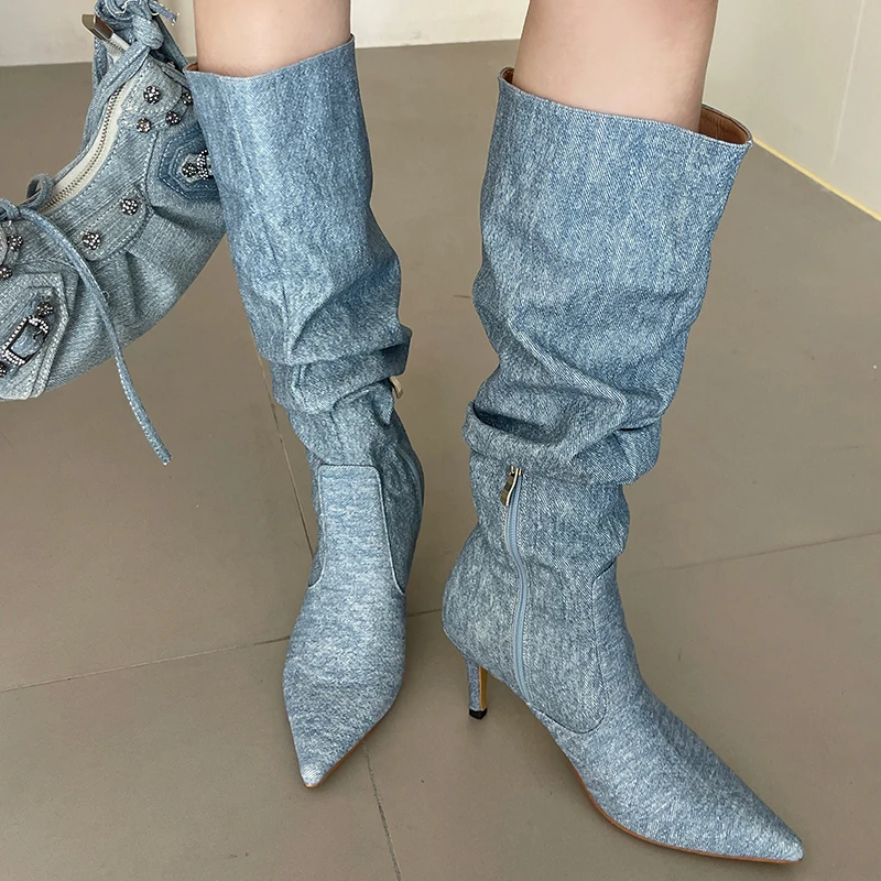 Женские ковбойские сапоги без шнуровки, осенние высокие сапоги до колена с острым носком и каблуком, 2023