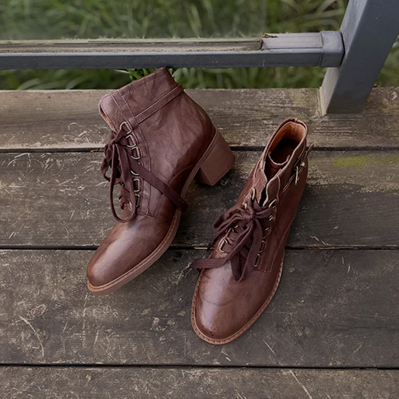 Женские кожаные ботильоны Heihaian, осень/зима 2023, новые сапоги на шнуровке в ретро стиле, с пряжкой и круглым носком