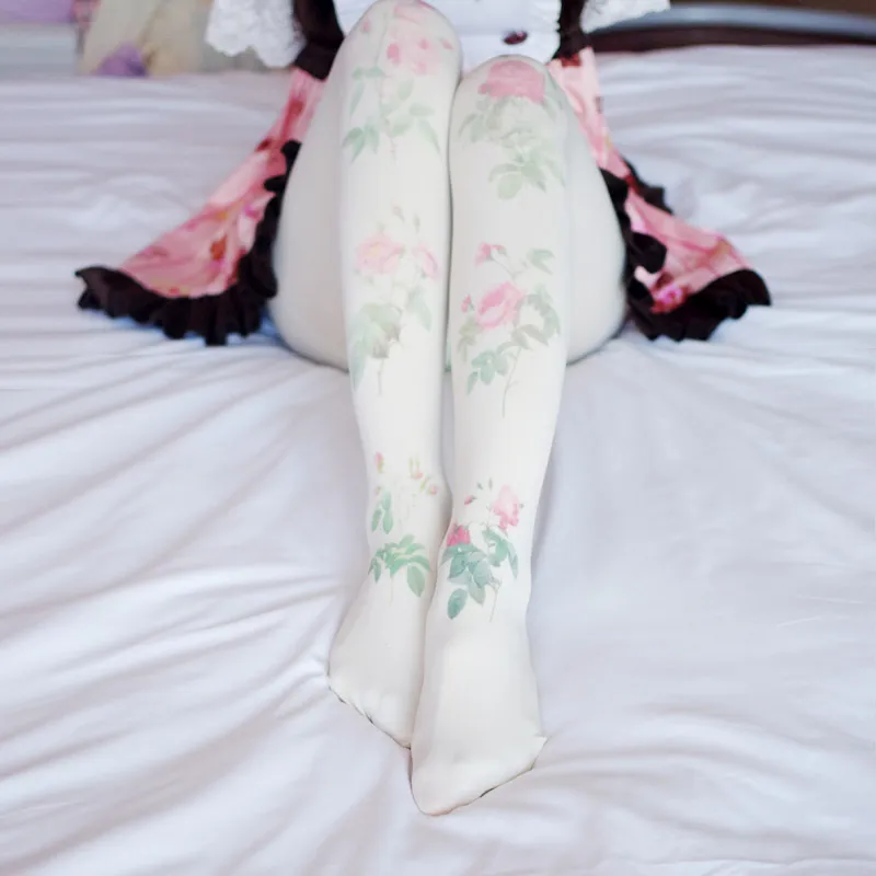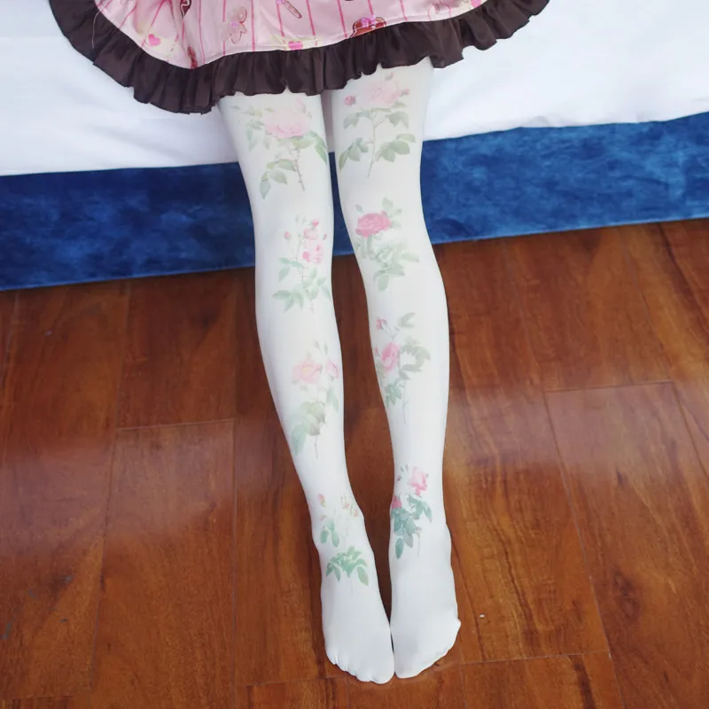 Женские колготки в стиле "Лолита", Колготки с принтом роз, милые студенческие колготки, бархатные белые колготки для ног, весна 2021