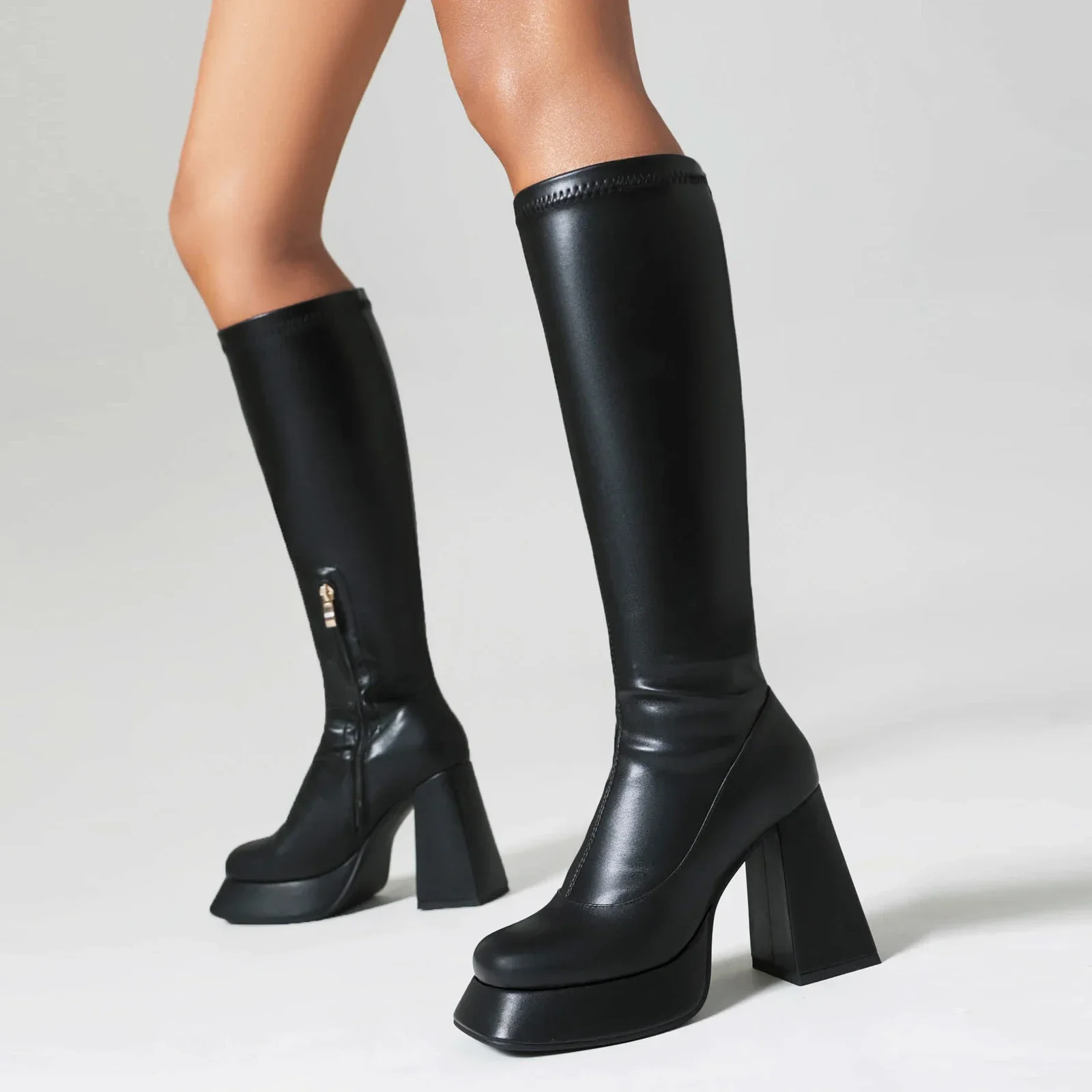 Женские конические сапоги до колена, удобные эластичные сапоги на платформе и толстом каблуке, с металлической молнией сбоку