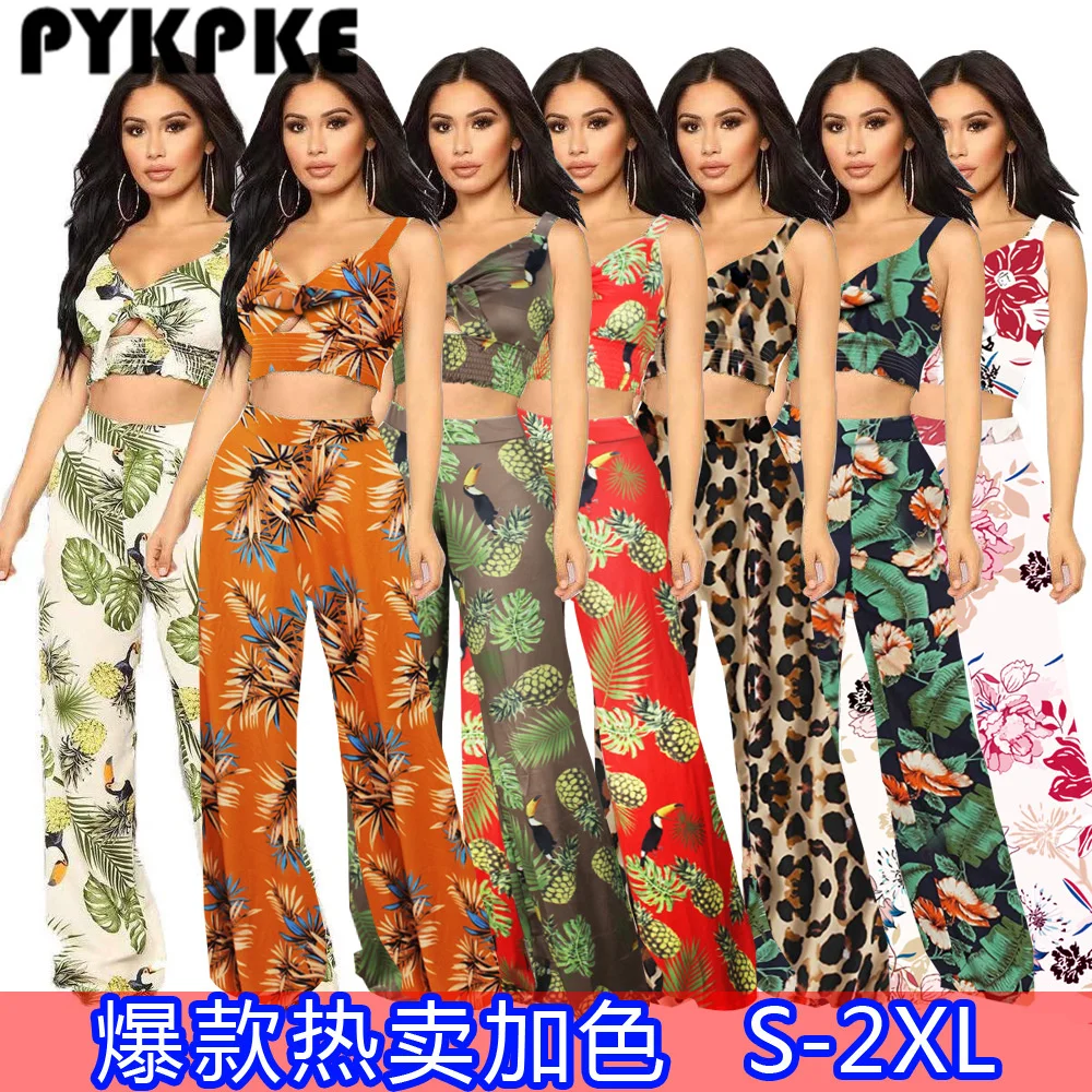 Женские костюмы с принтом, привлекательные топы на бретелях-спагетти со шнуровкой и широкие брюки, женские комплекты, весенние женские наря...