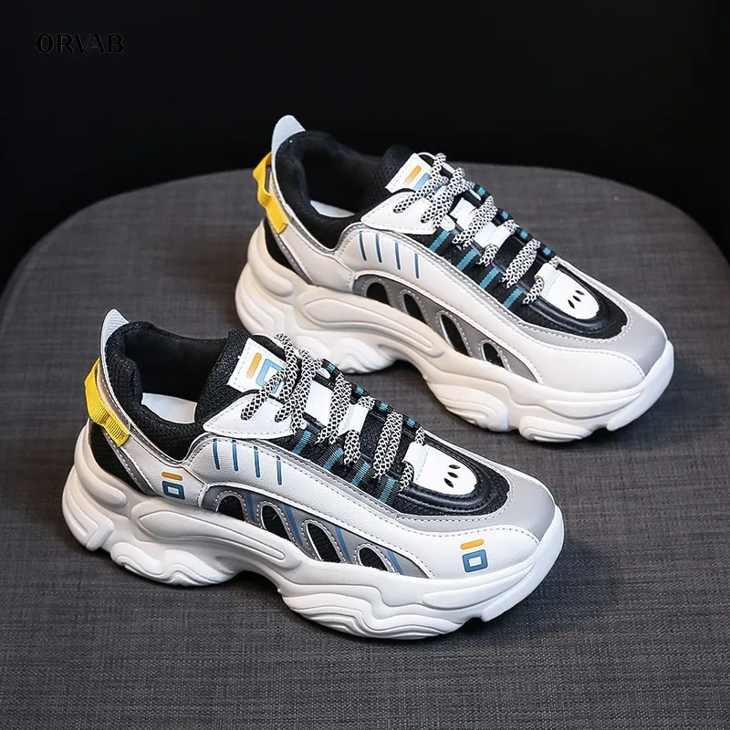 Leather Mesh Women Clunky Sneakers Thick Heel Mixed Colors Lace up Woman Trainers Brand Design Crystal Belt Casual Shoes