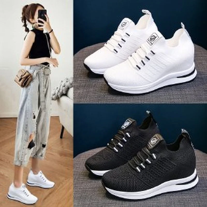 Женские кроссовки со скрытым каблуком, дышащие, на платформе, массивные, черные, белые, на лето